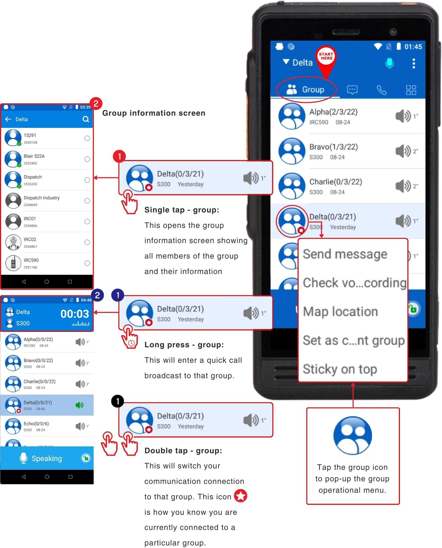 Double tap: on a group to switch your selection to that group, so that at the push of your PTT button, you will begin talking to that selected group.